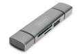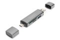 Der Dual Kartenleser von DIGITUS® mit integriertem USB-Hub (OTG) kann wahlweise am Smartphone, Tablet oder Notebook angeschlossen werden, so können Sie auf eingesteckte Speichermedien wie z. B. USB-Sticks, SD- oder MircoSD-Speicherkarten zugreifen. Sie können das Gerät entweder über den USB A (USB 3.0) oder über den USB-C™-Stecker des Hubs anschliessen. Der USB-Hub kann zeitgleich mit dem Speicherkartenleser genutzt werden, so können auch Dateien zwischen beiden Anschlüssen verschoben oder kopiert werden. Die Installation von Treibern oder Apps ist dank Plug and Play nicht notwendig. Ideal beispielsweise zur Sicherung von Urlaubsfotos direkt vor Ort, ohne ein Notebook nutzen zu müssen.