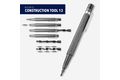 CONSTRUCTION TOOL 13 vereint 12 Präzisions-Bits in einem schlanken Tool-Pen – darunter auch spezielle Bits für Apple® Geräte. Die magnetische Spitze hält den Bit beim Arbeiten sicher in Position. Mit dem Stiftende können die Bits magnetisiert werden, damit kleine Schrauben leichter haften und nicht verloren gehen. Alle Bits sind ordentlich im Inneren des Aluminiumgehäuses verstaut. Mit integriertem Clip, Lineal in Zentimeter/Zoll und 1:20/1:50 Skala – ideal für feine Technikarbeiten und schnelle Reparaturen. Technisch durchdacht, präzise und einfach praktisch.