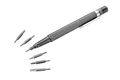 Bit-Stift mit 12 verschiedenen Präzisions-Bits, platzsparende Aufbewahrung im Stiftgehäuse, magnetische Spitze zur sicheren Fixierung der Bits, inklusive Spezial-Bits für Apple® Geräte und Standard-Bits für gängige Reparaturen im Haushalt, z.B. Küchenwaagen, LED-Lichterketten, Fernbedienungen, etc., integrierte Magnetisierfunktion am Stiftende zum einfachen Aufnehmen von Schrauben und Bits, mit Clip und Zentimeter-/Zoll-Lineal, 1:20/1:50 Skala, Aluminium, Chrom-Vanadium-Stahl, matt, titanfarben